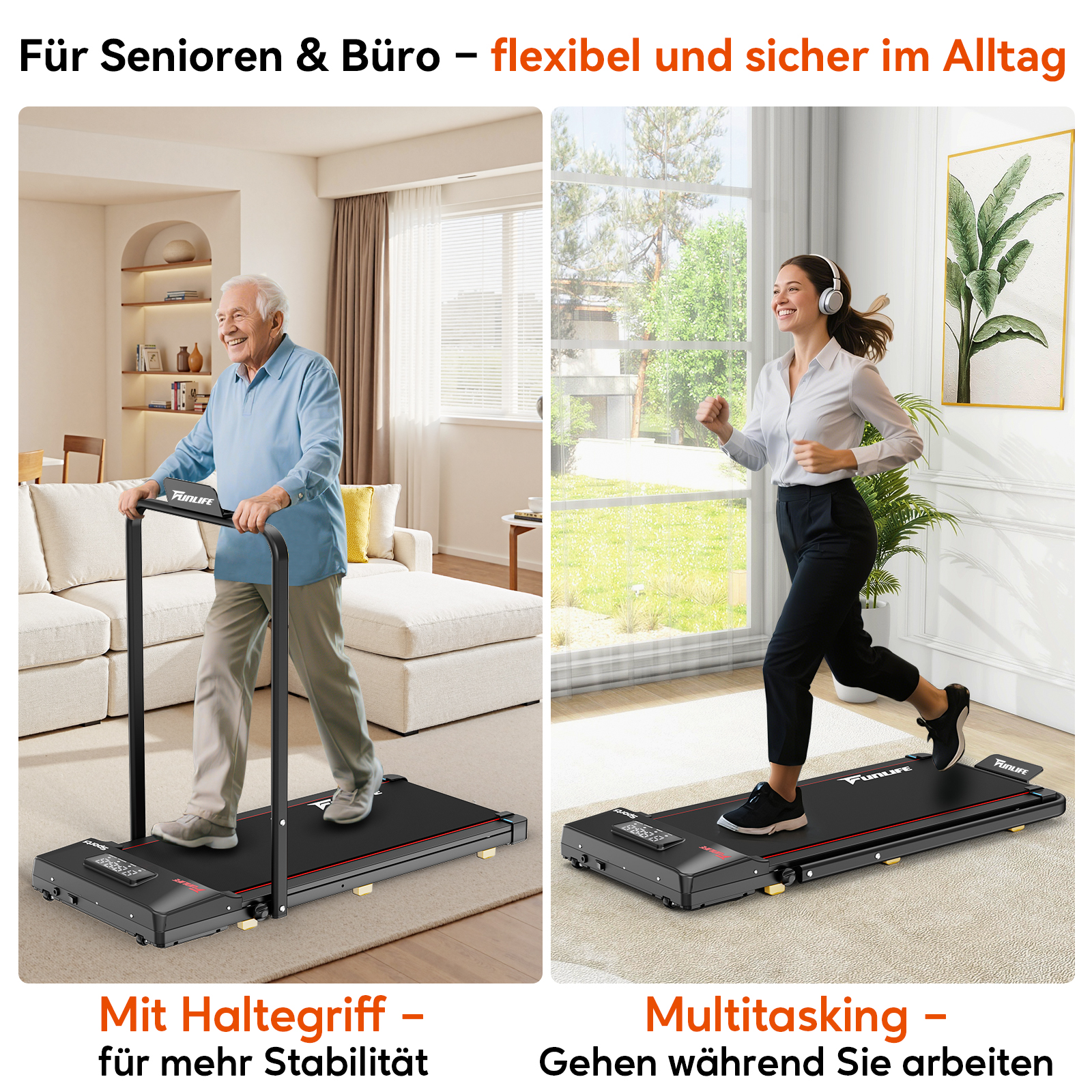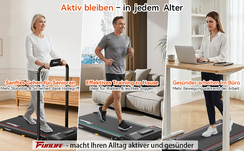 - Sicheres Walking Pad mit Haltegriff – Anders als viele andere Walking Pads bietet das FunLife F1 einen einklappbaren Sicherheitsbügel, perfekt für Senioren, Einsteiger, Reha und Nutzer mit Gleichgewichtseinschränkungen – auch bei langsamen 1 km/h.