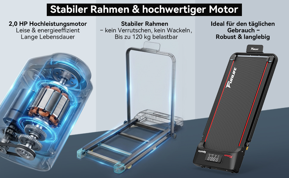 - Leise & leistungsstark – ideal für Wohnung & Büro – Der 2.0HP leise Motor arbeitet unter 50 dB. Perfekt für späte Einheiten oder das Training im Mehrfamilienhaus – ein flüsterleises Walking Pad für zuhause.