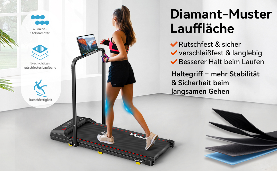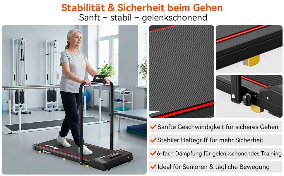 - Sicheres Walking Pad mit Haltegriff – Anders als viele andere Walking Pads bietet das FunLife F1 einen einklappbaren Sicherheitsbügel, perfekt für Senioren, Einsteiger, Reha und Nutzer mit Gleichgewichtseinschränkungen – auch bei langsamen 1 km/h.